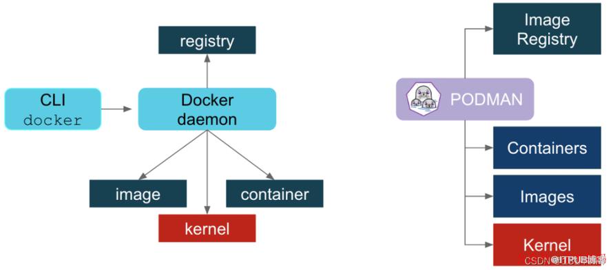 图中所体现的事情是,podman不需要守护进程,而dorker需要守护进程。在这个图的示意中,dorcker的containerd-shim与podman的common被归在Container一层。