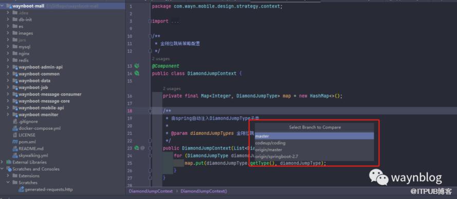 假如新功能分支上线前经历了多个人员参与迭代以及冲突修复,作为项目主程的你需要在项目上线前进行代码 review,以确保代码质量,那该如何操作嘞?其实 IDEA 已经贴心的为我们做好了一切,这里我将给大家介绍远程分支比较功能。