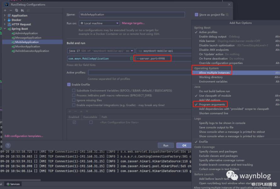 勾选打开 Operation System -> Alow multiple instance ,继续勾选打开 Java -> Program arguments,然后在 Program arguments 输入框中指定端口,在 Spring 项目中通过 --server.port=9999,如下图(注意每次启动实例时,这里的端口不能相同),