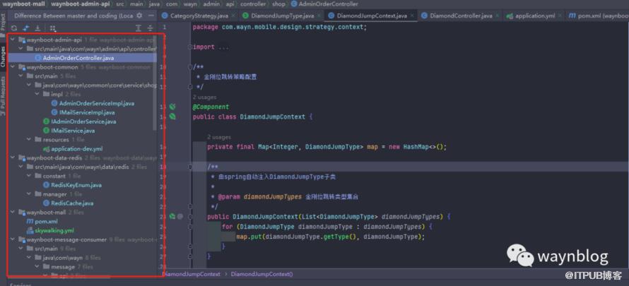 最后 IDEA 会显示所有的文件差异在项目左侧栏目,我们点击某个文件即可查看某个具体差异。