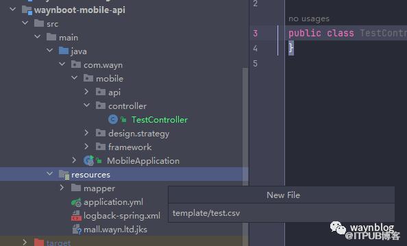快速创建文件夹的方式跟快速创建包目录差不多,只不过将 . 拼接改为 / 即可,如下图新建文件时填上 template/test.csv,