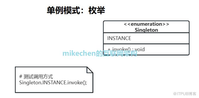 /*** 枚举实现单例模式** @author mikechen*/public enum SingletonEnum {INSTANCE;SingletonEnum() {}public void getName() {}}
