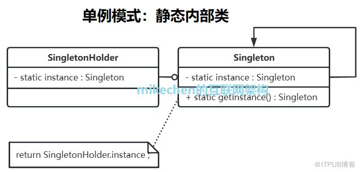 /*** 静态内部类实现单例模式** @author mikechen*/public class SingletonStatic {private SingletonStatic() {}public static SingletonStatic getInstance() {return SingLineHolder.instance;}private static class SingLineHolder {private static final SingletonStatic instance = new SingletonStatic();}}