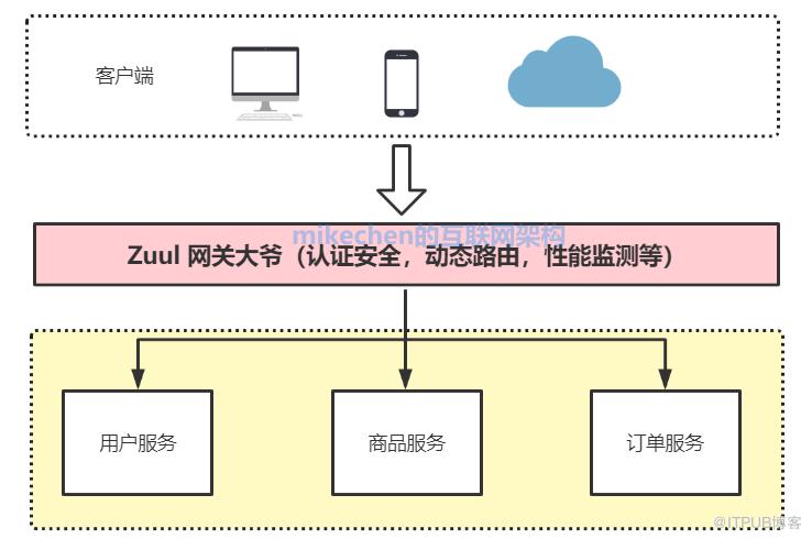 简单的话,Zuul 就是楼下保安亭的大爷,所有进入大楼的人,都需要大爷检查,得到大爷的许可。我们可以通过一张图理解。