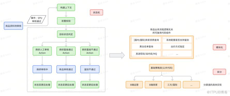 有更换状态机实现的可能,因此不希望状态机实现相关的代码与业务逻辑代码耦合; 不涉及状态机的场景,同样存在按渠道拆分逻辑的需要,比如新品申请编辑等等。