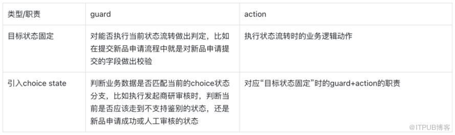 触发事件后的目标状态是固定的,比如选品审核时触发了选品不通过事件,新品申请的目标状态将确定为选品不通过; 触发事件后的目标状态需要经过代码逻辑判断,为此状态机配置中引入了choice state,比如发起商研审核的事件,新品申请的目标状态可能是直接不支持鉴别,也可能是新品申请直接通过,也可能是需要人工审核。