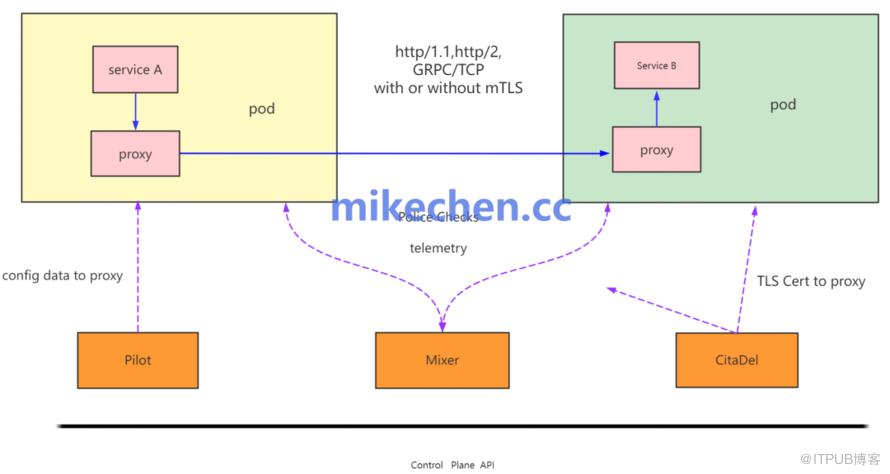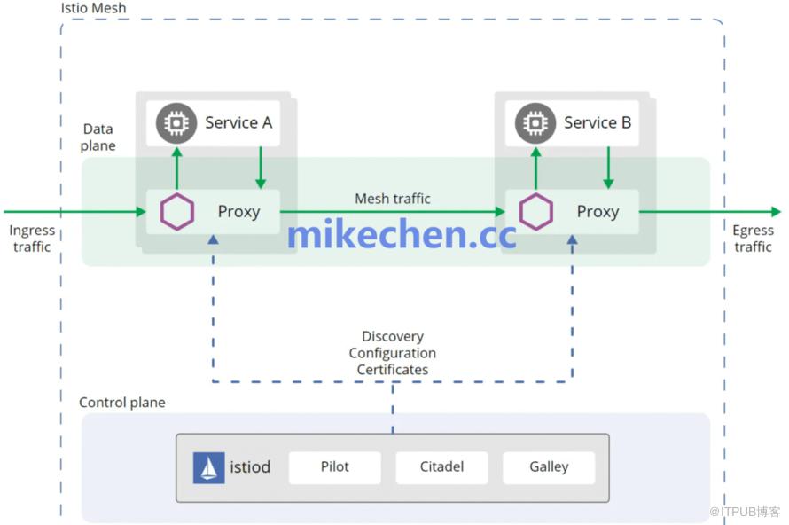 Istio的架构,由两部分组成:数据平面、和控制平面。