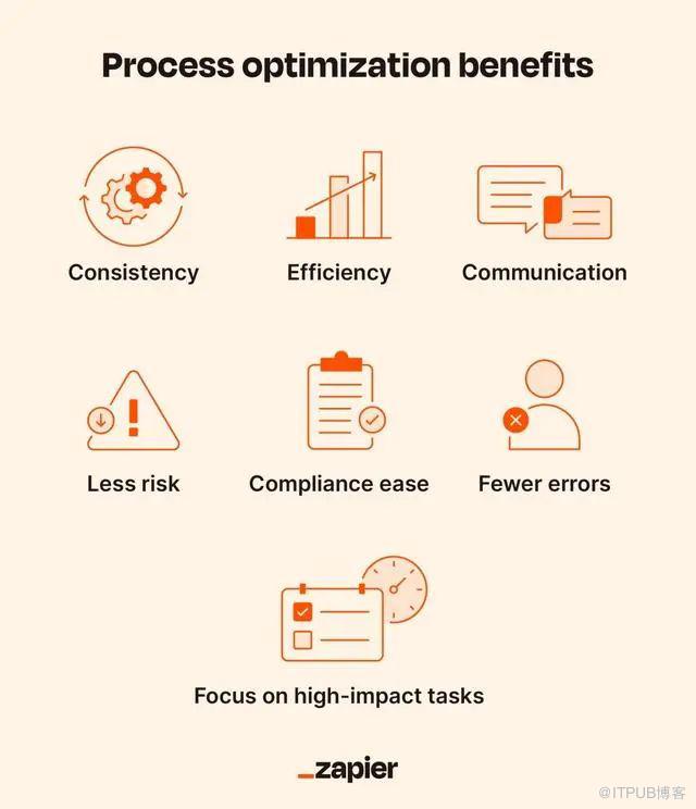 优化业务流程包括简化人力资源(HR,human resources)流程,节约资金,自动化生成潜在客户,每个业务经理都需要具备这些能力。对于周期性任务和复杂过程业务来说,优化业务流程将带来巨大的好处:(1)使结果更加一致:优化的流程更加简单,更加容易复制,从而产生更一致、可预测的结果。(2)提高生产效率:优化的流程减少了重复过程中的冗余、障碍和步骤,从而更快地完成从头到尾整个工作流程。(3)使风险趋向于更小:通过优化流程,我们就可以识别出代表不必要风险的流程步骤,及时删除它们或采取额外的预防措施。(4)使错误发生的机会更少:优化后的流程步骤更少、复杂性更低,会减少人为错误的机会。(5)使遵从性更加轻松:优化流程通过简化监视和报告程序优化遵从性。(6)使沟通更加顺畅:优化流程可消除团队之间的沟通障碍,或将有效的协作过程构建到工作流程中。(7)使团队成员更专注于更重要的任务:优化流程通过减少重复的、低影响力的任务,让团队成员腾出时间专注于更值得他们去花费时间的任务。03 9 种业务流程优化方法