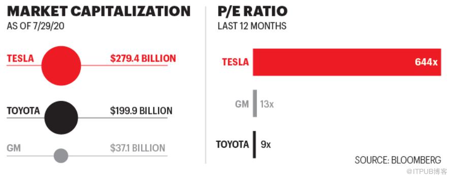 汽车行业的竞争在过去20年中发生了变化。特斯拉成立于 2003 年,自 2020 年 6 月以来成为最有价值的汽车制造商。其在研发方面的投资,专注于电动汽车和自动驾驶汽车,使特斯拉在行业中领先。如图所示,与其收益相比,特斯拉的估值比通用汽车等汽车制造巨头高出60多倍。