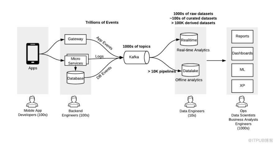 下图显示了从移动应用程序和服务到数据仓库和最终消费界面的数据流架构图。Uber最初的零碎反应尝试仅在数据流中发生数据问题的点上解决问题,解决的是症状而不是根本原因。Uber意识到需要一种整体方法来解决这些问题并端到端地解决问题。Uber的目标是重组数据记录系统、工具和流程,以实现整个Uber数据质量的阶梯式变化。Uber将整个端到端数据流堆栈的团队聚集在一起,其中包括堆栈各个部分的工程师和数据科学家,最终修改了20多个现有系统。