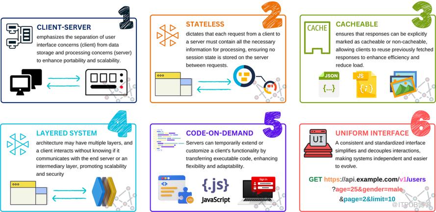 1.客户端-服务器架构: 这个原则将用户界面关注点与数据存储关注点分离,通过简化服务器组件从而提高界面在各平台上的可移植性,并通过简化服务器组件来增强可伸缩性。2.状态无关交互: 每个客户端到服务器的请求必须包含理解和处理请求所需的所有信息。服务器不存储有关客户端的任何会话信息。3.可缓存的响应: 在REST中,响应必须定义为可缓存或不可缓存。这意味着客户端可以将来等效请求的响应数据进行重用,减轻服务器负载并提高应用程序的效率。4.分层系统: 系统通常以具有特定功能的层组织,使得客户端难以判断它们是直接连接到最终服务器还是中间服务器。5.按需代码: 服务器可以通过传输可执行代码(例如Java小程序或JavaScript)来扩展客户端的功能。6.统一接口: 此约束简化并解耦架构,使每个部分能够独立发展。一致接口的四个指导原则是请求中的资源标识、通过表示操作资源、自描述消息和超媒体作为应用程序状态引擎(HATEOAS)。•自描述消息: 每个来自客户端的消息都带有详细的说明,就像一份精心编写的食谱,准确告诉服务器要做什么。•基于资源: 资源是API世界的名词,如用户、照片、细节,通过URI在请求中进行标识,就像互联网上的地址一样。•通过表示操作: 当客户端获取资源的表示时,它获取了修改或删除资源所需的所有详细信息,假设具有权限。