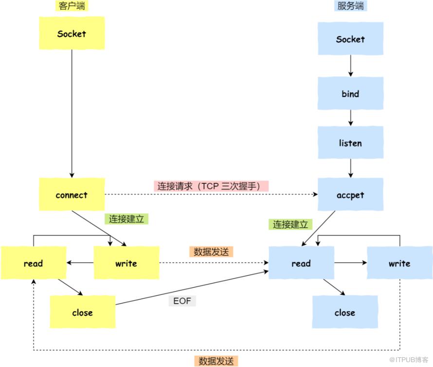 成功连接建立之后,双方开始通过 read 和 write 函数来读写数据,就像往一个文件流里面写东西一样。