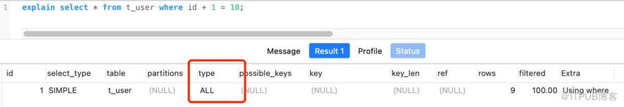然后我在条件查询中,用整型作为输入参数,此时执行计划中 type = ALL,所以是通过全表扫描来查询数据的。