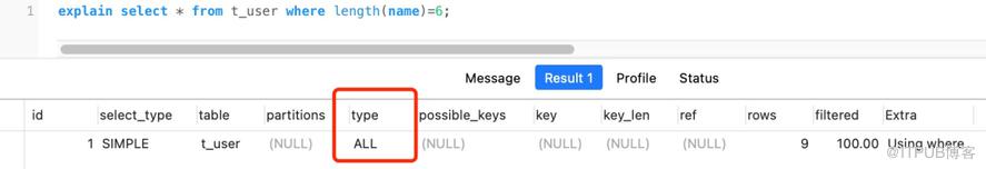 比如下面这条语句查询条件中对 name 字段使用了 LENGTH 函数,执行计划中的 type=ALL,代表了全表扫描: