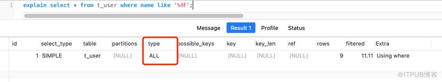 比如下面的 like 语句,查询 name 后缀为「林」的用户,执行计划中的 type=ALL 就代表了全表扫描,而没有走索引。