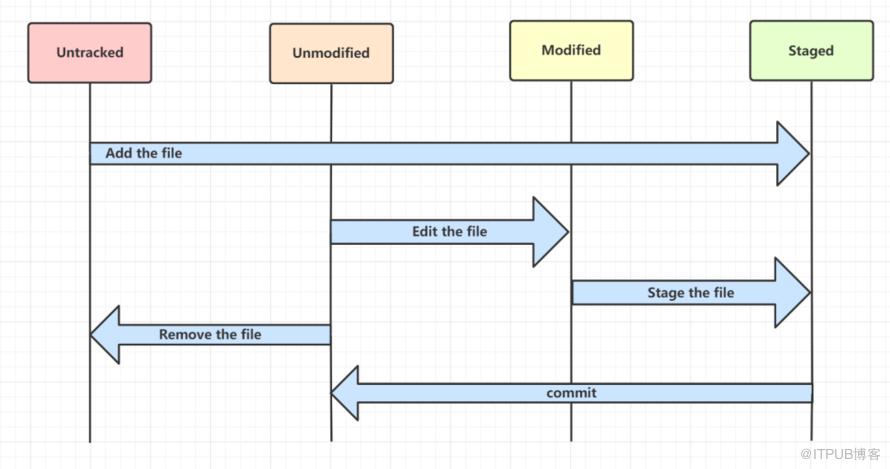 Untracked: 文件还没有加入到git库,还没参与版本控制,即未跟踪状态。这时候的文件,通过git add 状态,可以变为Staged状态 Unmodified:文件已经加入git库, 但是呢,还没修改, 就是说版本库中的文件快照内容与文件夹中还完全一致。Unmodified的文件如果被修改, 就会变为Modified. 如果使用git remove移出版本库, 则成为Untracked文件。 Modified:文件被修改了,就进入modified状态啦,文件这个状态通过stage命令可以进入staged状态 staged:暂存状态. 执行git commit则将修改同步到库中, 这时库中的文件和本地文件又变为一致, 文件为Unmodified状态.