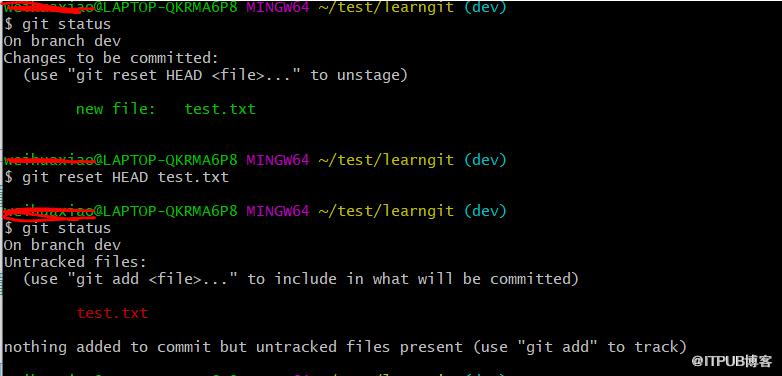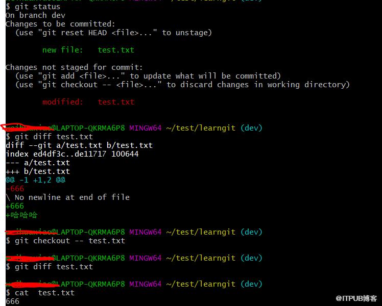 以下demo,使用git checkout -- test.txt 撤销了test.txt的修改