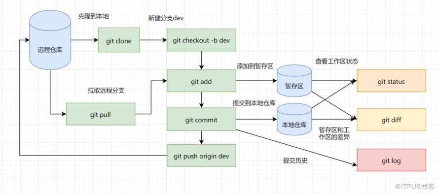 git clone git checkout -b dev git add git commit git log git diff git status git pull/git fetch git push