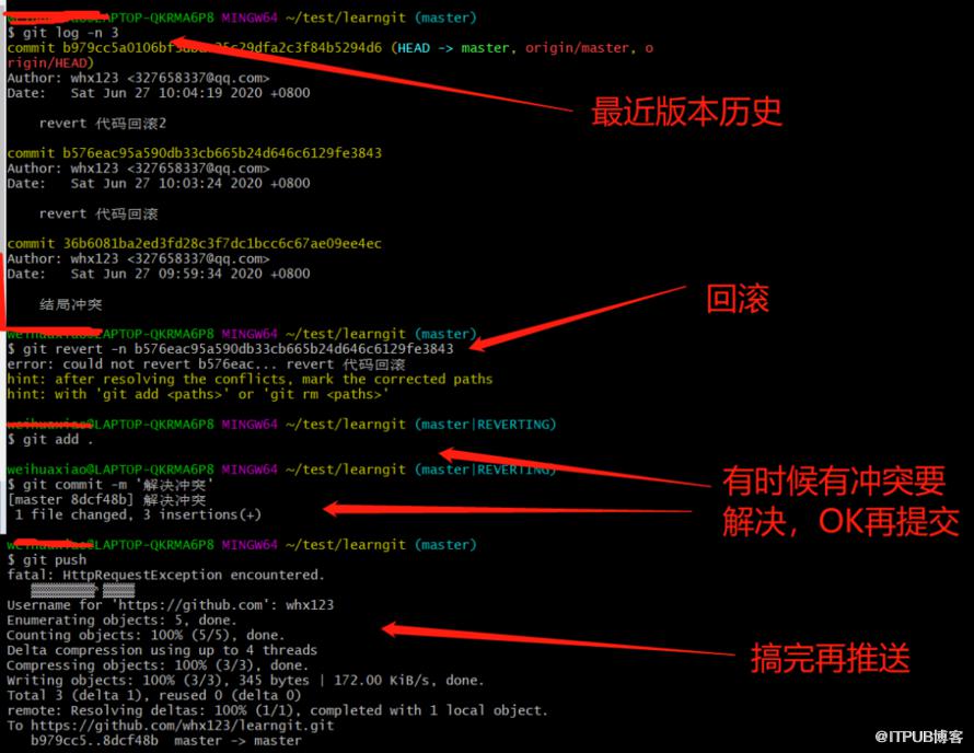 git log 得到你需要回退一次提交的commit idgit revert -n撤销指定的版本,撤销也会作为一次提交进行保存