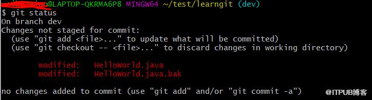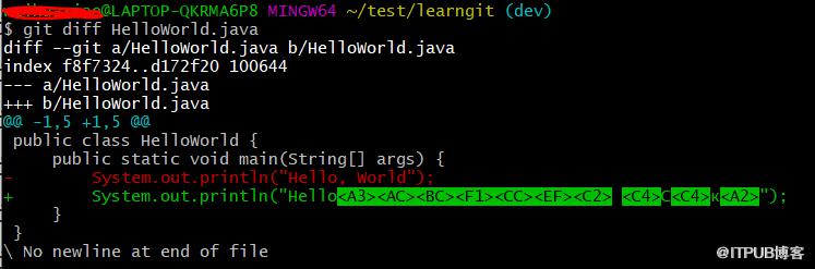 举个粟子吧,我们现在在dev分支,修改HelloWorld.java文件,假设修改了第三行,并且commit提交到本地仓库,修改内容如下: