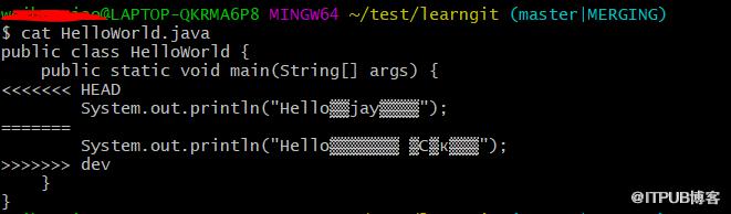 git merge提示冲突后,我们切换到对应文件,看看冲突内容哈,,如下: