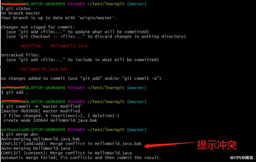 再然后呢,我们提交一下master分支的这个改动,并把dev分支合并过下,就出现冲突啦,如图所示: