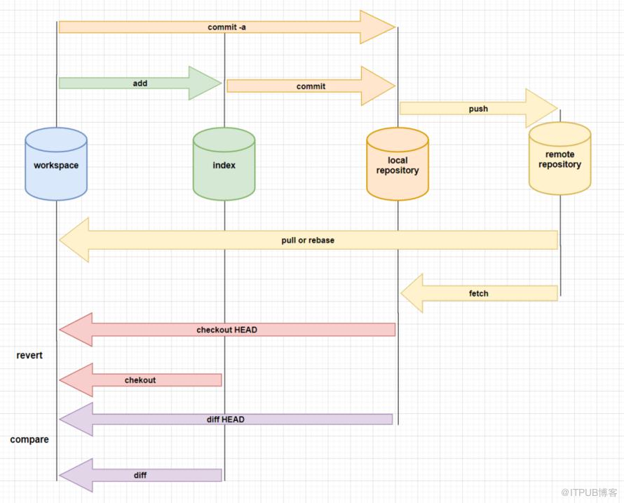 上一小节介绍完Git的四大工作区域,这一小节呢,介绍Git的工作流程咯,把git的操作命令和几个工作区域结合起来,个人觉得更容易理解一些吧,哈哈,看图: