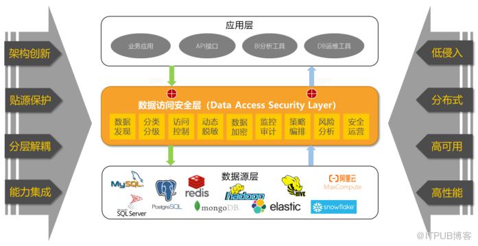 基于以上思考,数据应用和数据源之间抽象出了一个“数据访问安全层(DataAccessSecurityLayer,DASL)”,把过去散落在各种异构数据源系统、应用程序中的数据操作控制能力抽取出来,统一在这个数据访问安全层实现。当数据访问请求经过DASL时,未经过两个控制点:第一个是访问控制点,决定是否让数据访问请求通过、告警还是拒绝,会基于访问指令的风险程度和是否有权限访问目标数据对象进行判定;第二个是交付控制点,数据从数据库返回到达数据应用之前会经过DASL的交付控制点,会对数据实施对脱敏、加密等处理,满足安全和合规的需求。此外,DSAL会进行完整的访问和交付的过程及动作的数据安全审计和风险分析。