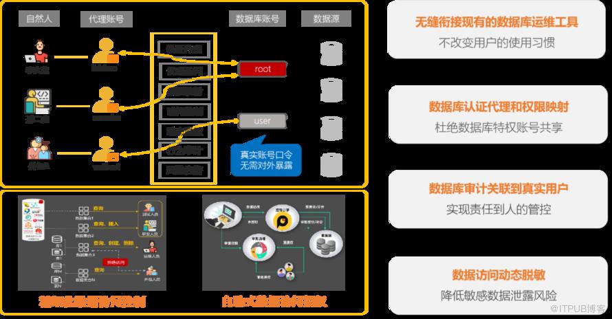 无缝数据共享账号治理 | 基于用户认证代理技术,以原点用户映射真实数据访问主体,代替数据源真实账号口令,缩窄数据源真实口令的暴露面,降低泄露风险。 结合访问账号的主体属性,账号活动的权限、行为、环境、时间,数据的业务和安全属性等维度作为交叉结合的观测指标,提升事前防范、事中监督和事后追溯的精准性和有效性。 |