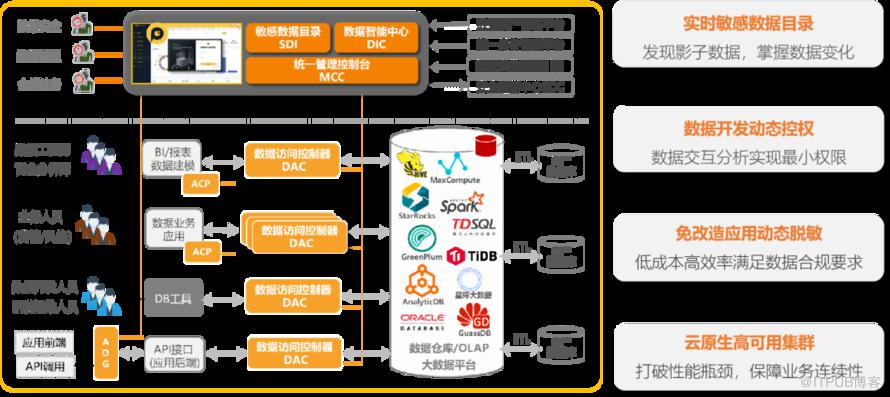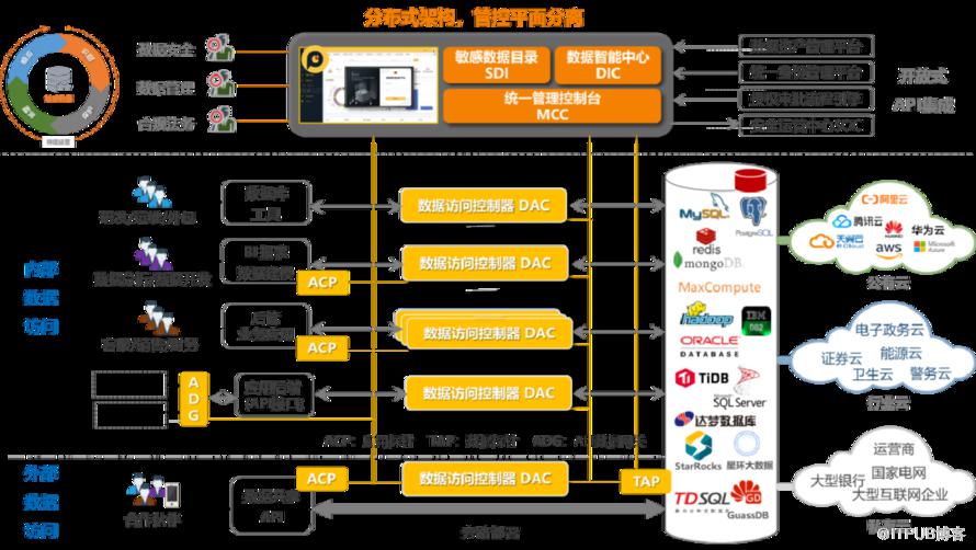 统一管控控制台MCC(ManagementControlCenter)是集中统一管理控制入口,数据安全管理人员可以使用MCC管理和配置数据源,基于敏感数据资产目录配置敏感数据访问控制策略和交付策略,对数据保护和审计控制能力进行一体化编排,集中远程管理探针,检索查询数据安全审计日志并出具审计报告,进行数据安全风险事件的分析和处置。MCC是“中控台”,DAC和ACP则是相对独立的“无状态”产品组件,可以根据企业应用程序和数据源的分布情况单点或多点部署,之后通过MCC集成整合在一起,构成完整的一体化数据保护和审计解决方案。