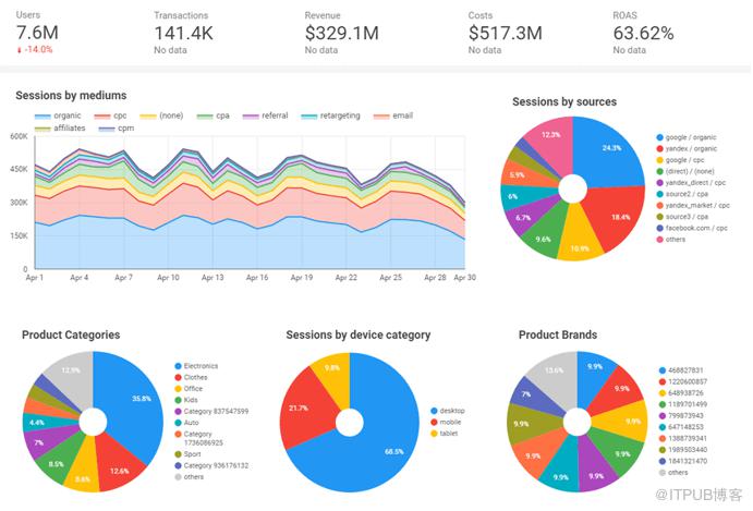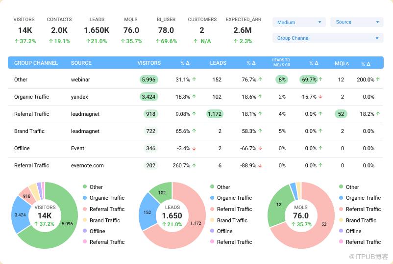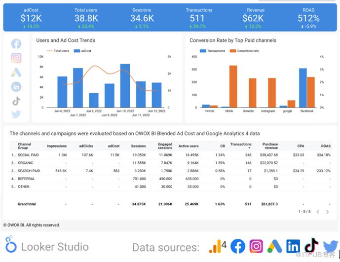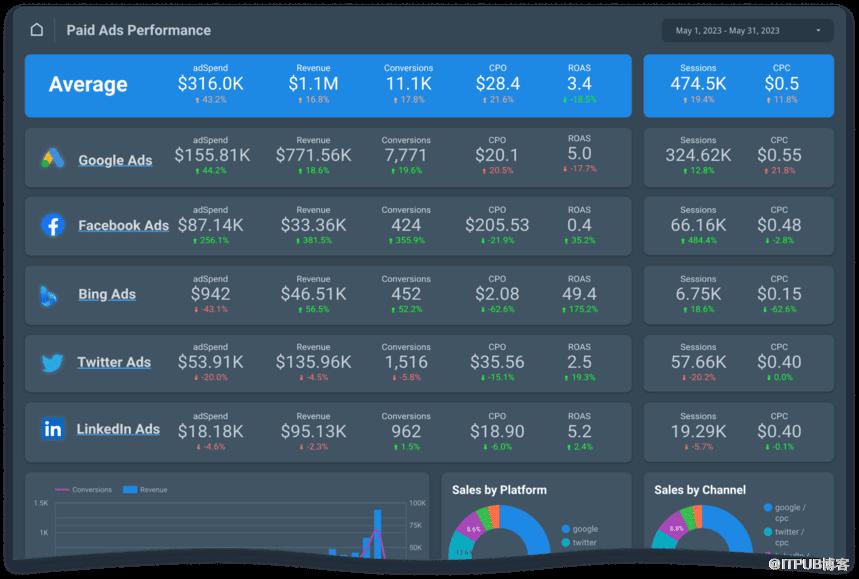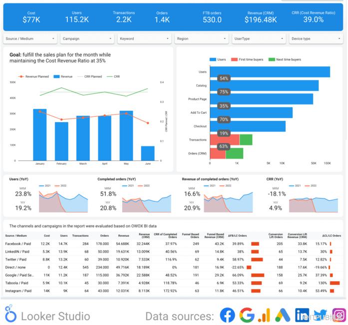 当需要评估绩效并实时监控 KPI 时,需要一份总体报告。例如, BI 的CMO 仪表板显示了所有营销渠道、流量、广告平台、网站用户行为指标、归因模型和公司增长的绩效。