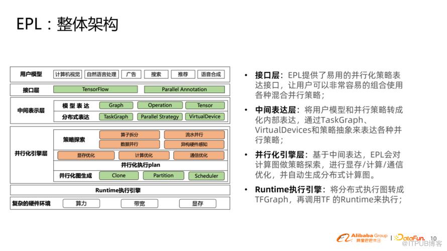 EPL 是一个统一多种并行策略、易用的分布式深度学习训练框架,它将不同的并行策略进行了统一抽象。在一套分布式训练框架中,支持多种并行策略,包括数据并行、流水并行和算子拆分并行,并支持不同策略的组合和嵌套使用。同时 EPL 提供了灵活应用的接口,用户只需要添加几行代码就可以实现丰富的并行化策略。模型侧不需要去做任何的代码改动。除了用户手动标记并行策略之外,EPL 也支持自动的并行策略探索,包括自动的算子拆分策略以及流水并行中的自动 layer 切分策略等等。EPL 在框架层面也提供了全方位的优化,包括多维度的显存优化、计算优化、通信优化等,从而实现高效的分布式训练性能。