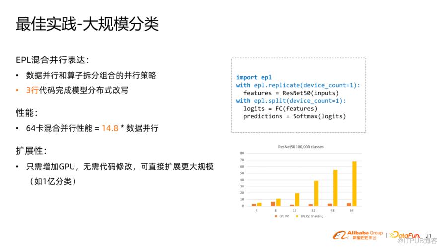 如果我们采取一个单纯的数据并行,从 timeline 里可以看到全连接层的通信会成为整个模型训练的瓶颈。在这里我们采取的混合并行策略是对特征提取层去做数据并行,对超大的全连接层去做算子拆分来消除全连接层的通信瓶颈。通过这样三行代码的改造,我们就可以为这个大规模分类模型实现一个混合的分布式策略。在实测中,我们会发现整体的梯度同步开销可以减少 90% 左右,从而得到一个更好的分布式性能。