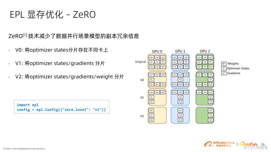 除了刚才提到的 Gradient checkpoint 技术,EPL 中还实现了类似 DeepSpeed 的 ZeRO 的功能。ZeRO 显存优化技术是通过减少数据并行场景中的模型副本的冗余信息,从而减少整体的峰值显存利用。我们可以通过开启不同级别的 ZeRO 来得到不同程度的显存优化和性能的 trade off。其中 V0 是将 optimizer states 分片存储在不同的卡上。V1 是将 optimizer states 以及 Gradients 都分片存储;V2 会将 optimizer states gradients 以及 weight 都做一个分片存储。EPL 中实现的 ZeRO 也是在基于计算图的分析来自动实现,无需用户的干预。用户只要通过设置 EPL 的 config 中的 zero level 就可以开启不同程度的 ZeRO 的功能。