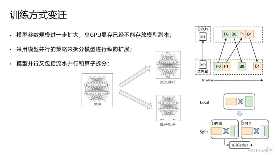 一种常见的做法是采用模型并行来对模型进行拆分,把模型的子图放置在不同的 GPU 卡上进行扩展。常见的模型并行又包括流水并行和算子拆分并行。