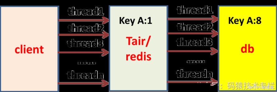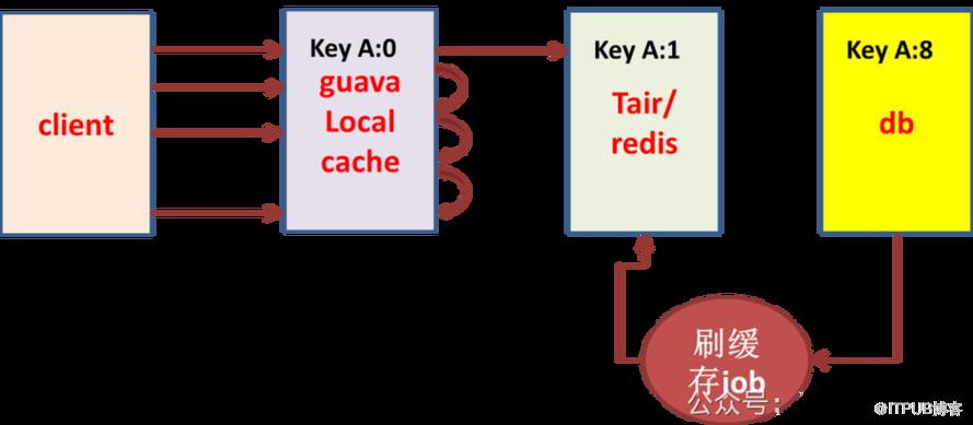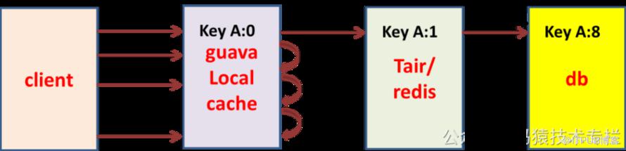 如果我们再增加一层本地缓存(guava,比如超时时间设置为1秒),保证单机对一个key只有一个请求回源,那样对tair/redis这层资源的使用就可以预知了。假设有500台client,对一个key来说,一瞬间最多500个请求穿透到Tair/redis,以此类推到db。