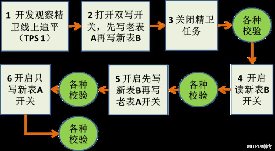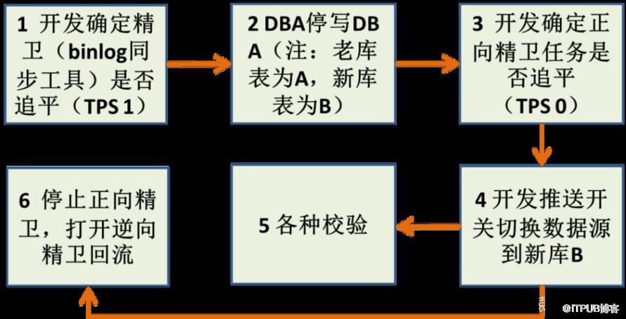 3) 增量同步。全量迁移完成后可使用binlog增量同步工具来追数据,比如阿里内部使用精卫,其它企业可能有自己的增量系统,或者使用阿里开源的cannal/otter:
