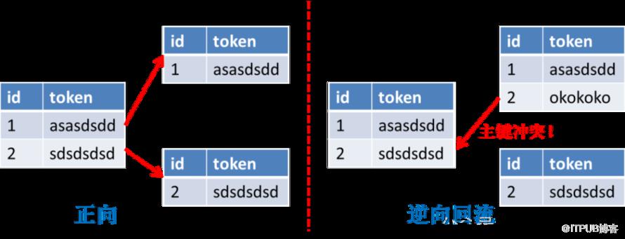 正向迁移扩容中,通过自增的主键,到了新的分库分表里一定是唯一的,但是,我们要考虑迁移失败的场景,如下图所示,新的表里假设已经插入了一条新的记录,主键id也是2,这个时候假设开始回滚,需要将两张表的数据合并成一张表(逆向回流),就会产生主键冲突!