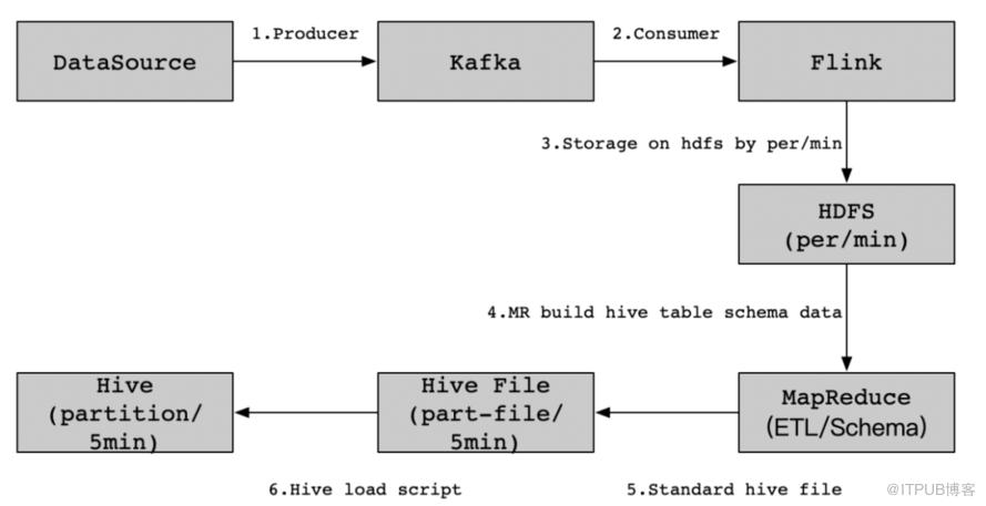 在一些特殊的场景下,Flink SQL如果无法实现我们复杂的业务需求,那么我们可以考虑使用Flink DataStream写Hive这种实现方案。比如如下业务场景,现在需要实现这样一个业务需求,内容方将实时数据写入到Kafka消息队列中,然后由数据侧通过Flink任务消费内容方提供的数据源,接着对消费的数据进行分流处理(这里的步骤和Flink SQL写Hive的步骤类似),每分钟进行存储到HDFS(MapReduce任务需要计算和重跑HDFS数据),然后通过MapReduce任务将HDFS上的这些日志数据生成Hive所需要格式,最后将这些Hive格式数据文件加载到Hive表中。实现Kafka数据到Hive的即席分析功能,具体实现流程细节如下图所示: