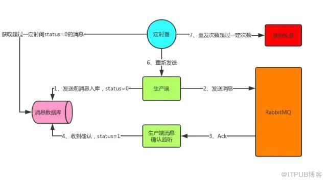 首先发送消息前先将消息保存到数据库中,有一个状态字段status=0,表示生产端将消息发送给了RabbitMQ但还没收到确认。在生产端收到确认后将status设为1,表示RabbitMQ已收到消息。