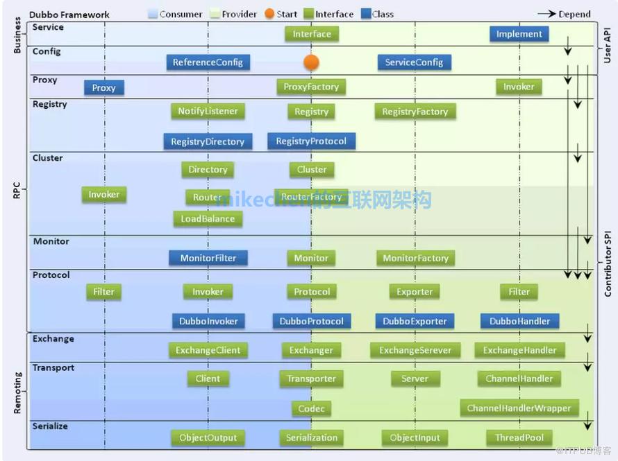 服务代理层(Proxy):服务接口透明代理,生成服务的客户端Stub和服务器端Skeleton,以ServiceProxy为中心,扩展接口为ProxyFactory。