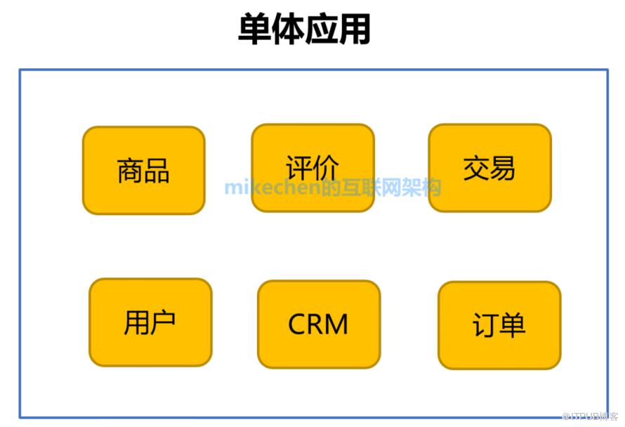 当网站流量很小时,只需一个应用,将所有功能都部署在一起即可。