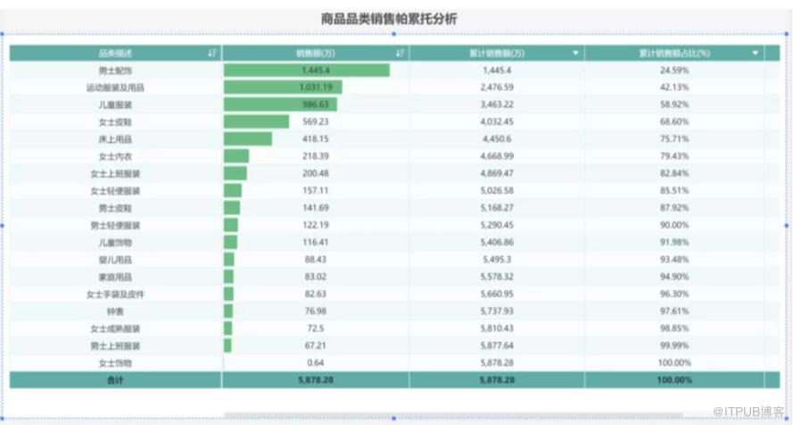 其核心思想就是少数项目贡献了大部分价值。以款式和销售量为例:男士服饰、运动服装及用品、儿童服装、女士皮鞋占总体销售额的70%以上。