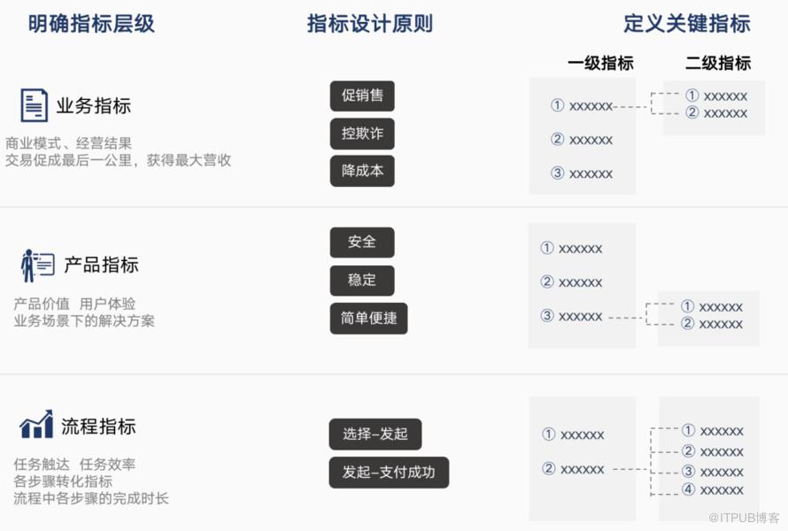 基于此,一开始就把指标进行分层级,分为业务、产品和流程三个层级,业务关注业务的,产品关注产品的。不同层级的指标有不同的思考维度和分析方法。