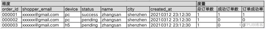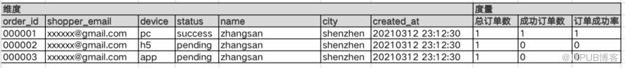 在上述订单表中,device、city 等是维度,对order_id 计数的总订单数、对status = success 计数的成功订单数是度量。