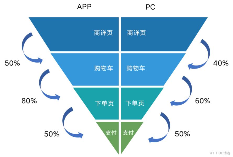 如下图所示,我们可以观察用户在每一个环节上的转化率,寻找转化路径的薄弱点,优化产品,提升用户体验,最终提升整体的转化率。