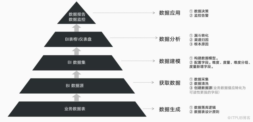 在整个数据分析的框架中,分为五大层次,依次是:数据生成、获取数据、数据建模、数据分析和数据应用。