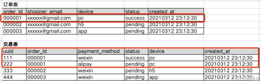 还是以支付业务为例,用户选择支付方式完成支付后,落库核心的两张业务表:订单表和交易表。一个订单会对应多笔交易(每选择一种支付方式生成一笔交易,一笔订单可以使用多个支付方式尝试支付),其实还会产生其他表,比如收货地址表等。