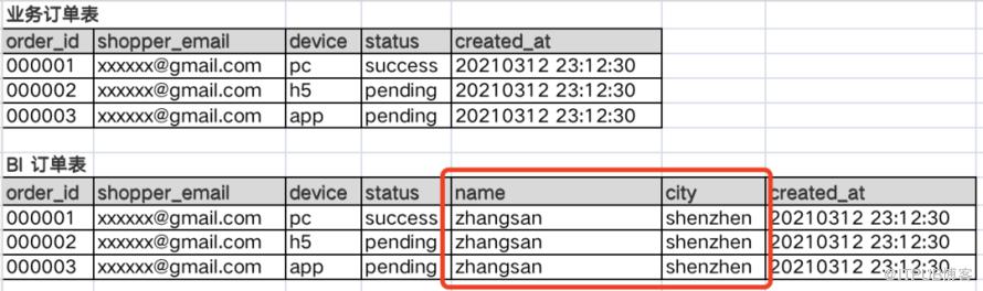 比如上述的业务底层订单表到了数据分析阶段衍生的订单表字段发生变化,name 和 city 是从业务地址表取来的数据。