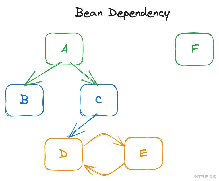有环图是很难处理的,一种朴素的想法就是将其转化为有向无环图(DAG)。图里的环(D - E)来自于循环依赖,我们要做的就是将循环依赖的bean当做是同一组。得到DAG后,就可以先加载下层的bean,然后同一层的bean做并行加载。在issue中也有人提出了这个想法。我个人理解,这个方案的难点在于: